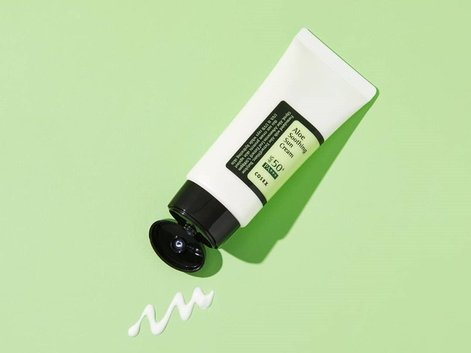 Aloe Soothing Sun Cream SPF50+ PA+++ từ COSRX là loại kem chống nắng vật lý, có tác dụng bảo vệ làn da khỏi tia UVA và UVB. Ưu điểm của sản phẩm là chiết xuất từ lá lô hội, giúp duy trì và cung cấp độ ẩm cho làn da. Ngoài ra, nó mang lại cảm giác nhẹ nhàng như loại kem dưỡng ẩm và không để lại vệt trắng trên da. Sản phẩm này được bán với giá hơn 370.000 đồng cho dung tích 50 ml. Ảnh: Beauty Hub.