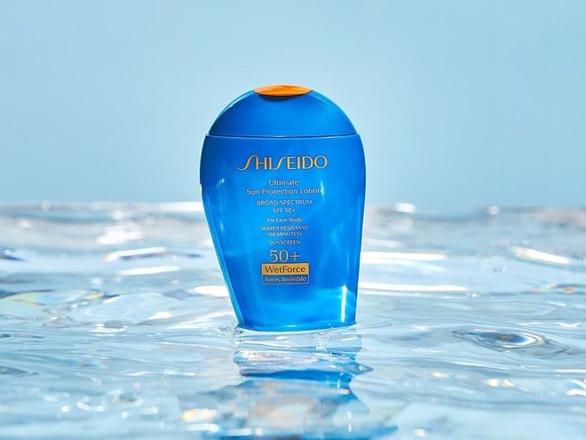 Shiseido Ultimate Sun Protector Lotion SPF 50+ Sunscreen đươc cải tiến với công nghệ WetForce và HeatForce. Khi bạn đổ mồ hôi hay bị ướt, sản phẩm sẽ trở nên hiệu quả hơn mà không gây ra vệt trắng. Điều này có được là nhờ các ion âm trong công thức kết hợp với các ion dương trong mồ hôi và nước, tạo thêm lớp chống nắng vô hình. Ngoài ra, tinh chất nhiệt trong kem được kích hoạt bởi nhiệt bên ngoài, tạo thành rào cản mạnh mẽ. Sản phẩm chống nắng cho mọi loại da, hiện có giá 580.000 đồng cho chai 50 ml và hơn một triệu đồng cho chai 150 ml. Ảnh: Alo Japan.