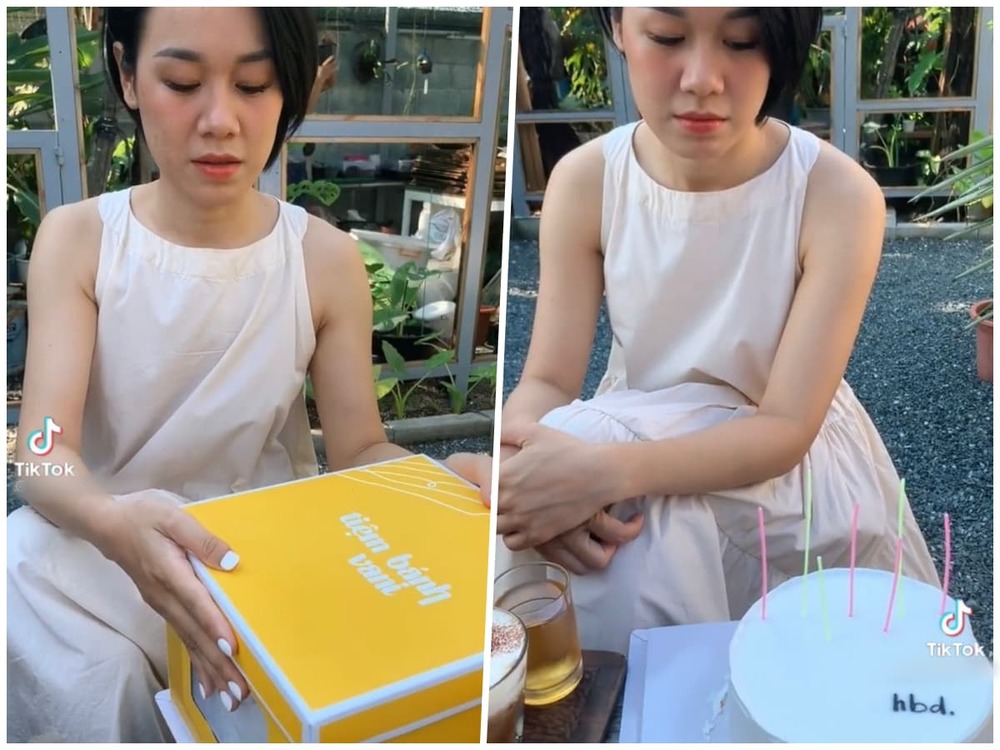 Ở đoạn clip còn lại, một cô gái trẻ trang điểm cẩn thận, mặc chiếc váy xinh xắn để mừng tuổi mới bên bạn bè. Tương tự tình huống trên, bạn nữ này cũng tỏ rõ sự háo hức và cố gắng duy trì động tác mở hộp nhẹ nhàng nhất có thể. Thế rồi, khi thấy chiếc bánh chỉ với vỏn vẹn 3 chữ “hbd” cùng vài chiếc nến cắm ở trên, cô nàng đã trưng ra biểu cảm thất vọng.